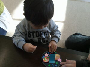 今日のわかっこ教室は、季節の製作として「こま製作」をしましたよ。