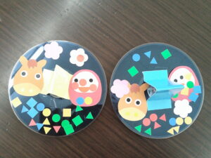 まずは、今年の干支のうまとだるまさんにシールで顔をつけて、DVDとビー玉でできたこまに貼りました。