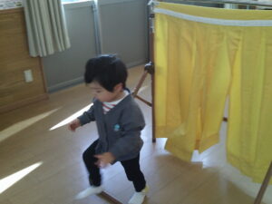 平均台をそろそろと歩いたら、しゃらしゃらの布を走り抜け、フラフープをくぐったりとび箱の山をとびこえたりして、たくさん体を動かすことができましたね!