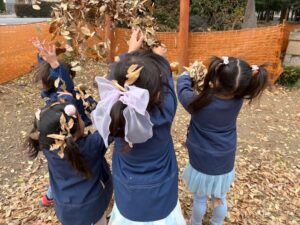 たくさん集めてお布団にしたり、落ち葉のシャワーをしたり、思い思いに楽しんでいますよ。