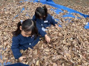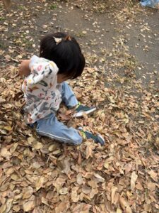 たくさん集めてお布団にしたり、落ち葉のシャワーをしたり、思い思いに楽しんでいますよ。